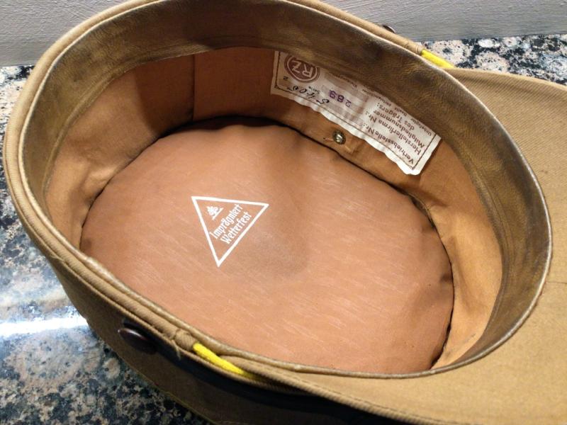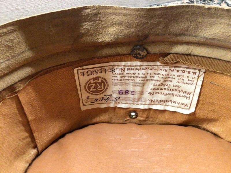 EARLY LARGE WHITE RZM TAG, MAKER NUMBER 289,OSKAR HERTLEIN, ADOLF HITLER STRASSE, ERLANGEN. RIVETS SECURED CHINSTRAP, DATES THIS KEPI TO 1934/35.