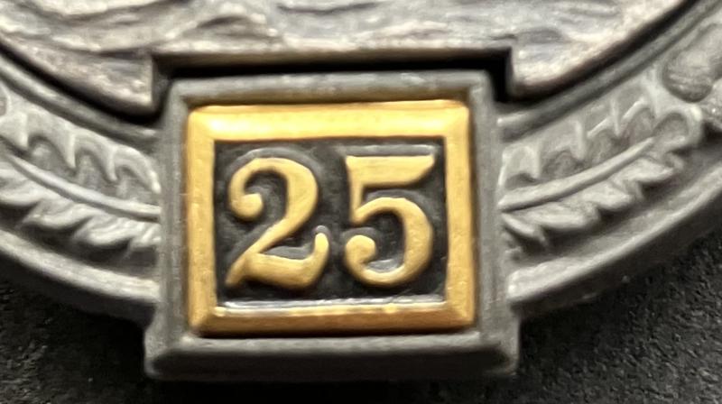 EXCELLENT ZINC PANZER BADGE FOR 25 DAYS OF ARMOURED COMBAT. MAKER GUSTAV BREHMER MARKNEUKIRCHEN. TRACES OF SILVER TO WREATH. EXCELLENT DETAIL, BRASS INSET 25.
