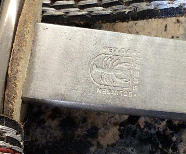 SUPERB GRIP WITH INSET POLICE BADGE,, NICKLE SILVER FURNITURE. AND SS RUNES TO POMMEL. BLADE WITH CLEAR KREBS TRADEMARK.