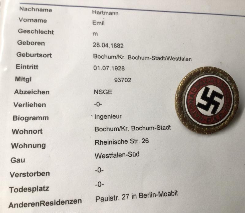 BADGE NUMBER 93702 TO EMILHARTMANN, OF BERLIN.