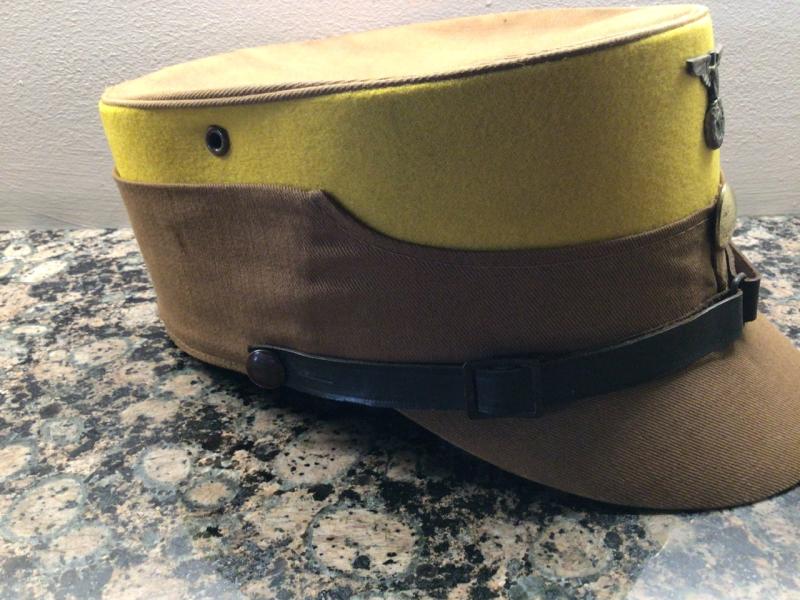 EARLY LARGE WHITE RZM TAG, MAKER NUMBER 289,OSKAR HERTLEIN, ADOLF HITLER STRASSE, ERLANGEN. RIVETS SECURED CHINSTRAP, DATES THIS KEPI TO 1934/35.